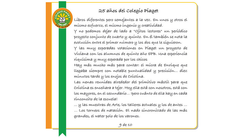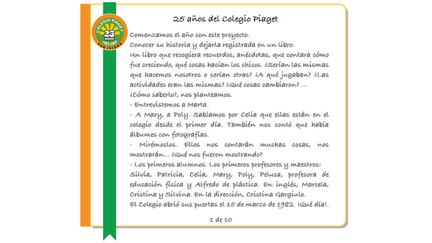 Cuando Girasoles cumplía 10 años, sus fundadoras empezaron a trabajar en un proyecto educativo que diera continuidad al Nivel Inicial, y en 1982, junto a Cristina Gargiulo, docente de Primaria, pusieron en marcha 1º y 2 º grado del Colegio Piaget. El nombre que eligieron es un homenaje al guía de su línea pedagógica.